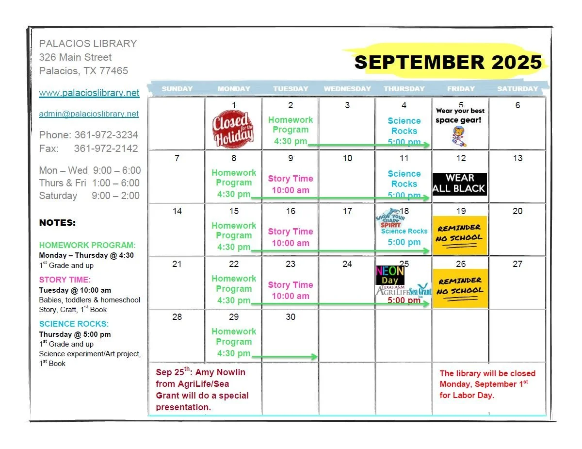 Spark a lifelong love of reading in your child by bringing them to the Palacios Library on Tuesdays at 10:00 AM for story time and crafts. After your child finishes the craft they get to choose and take home a 1st Book to keep. Babies, toddlers, and homeschooled children are welcome.
