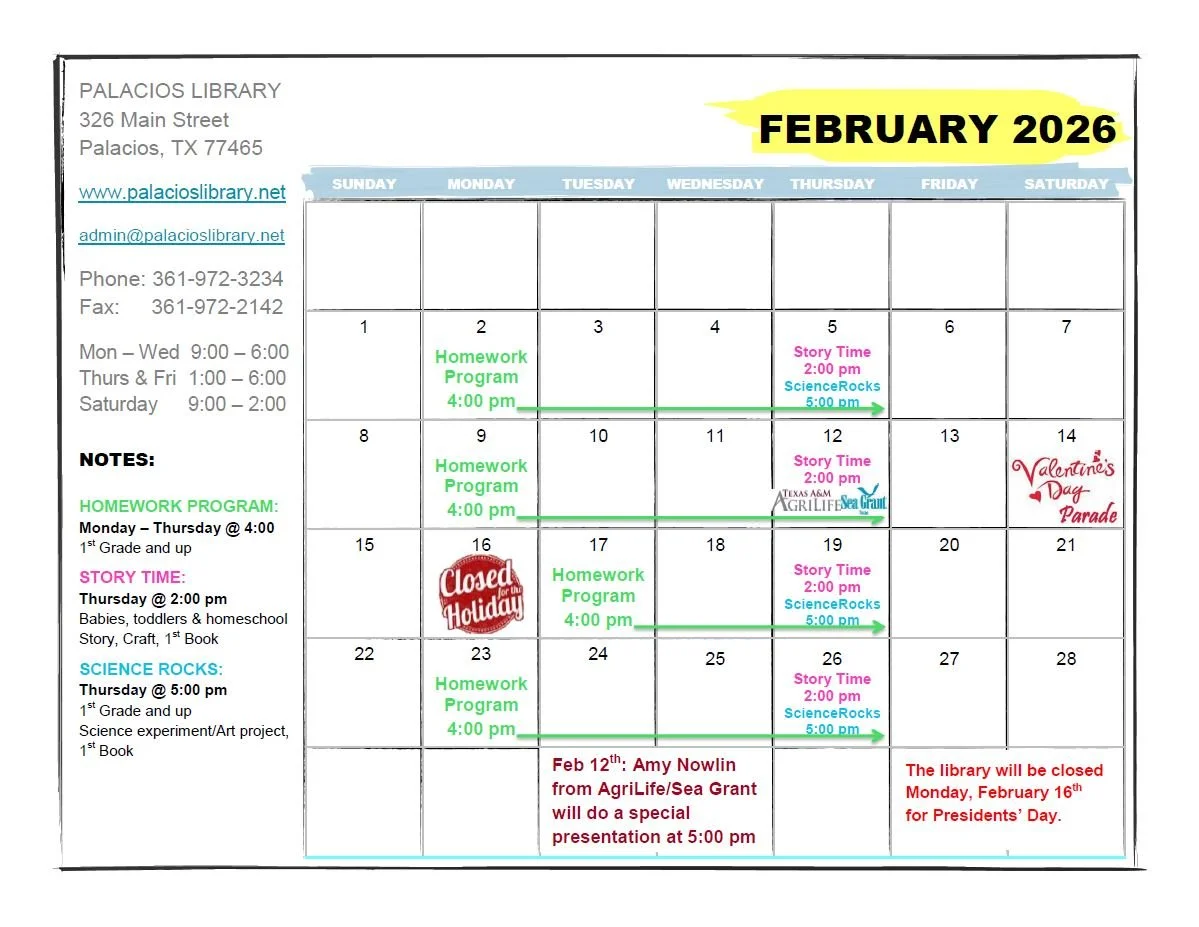 Spark a lifelong love of reading in your child by bringing them to the Palacios Library on Thursdays at 2:00 PM for story time and crafts. After your child finishes the craft they get to choose and take home a 1st Book to keep. Babies, toddlers, and homeschooled children are welcome.